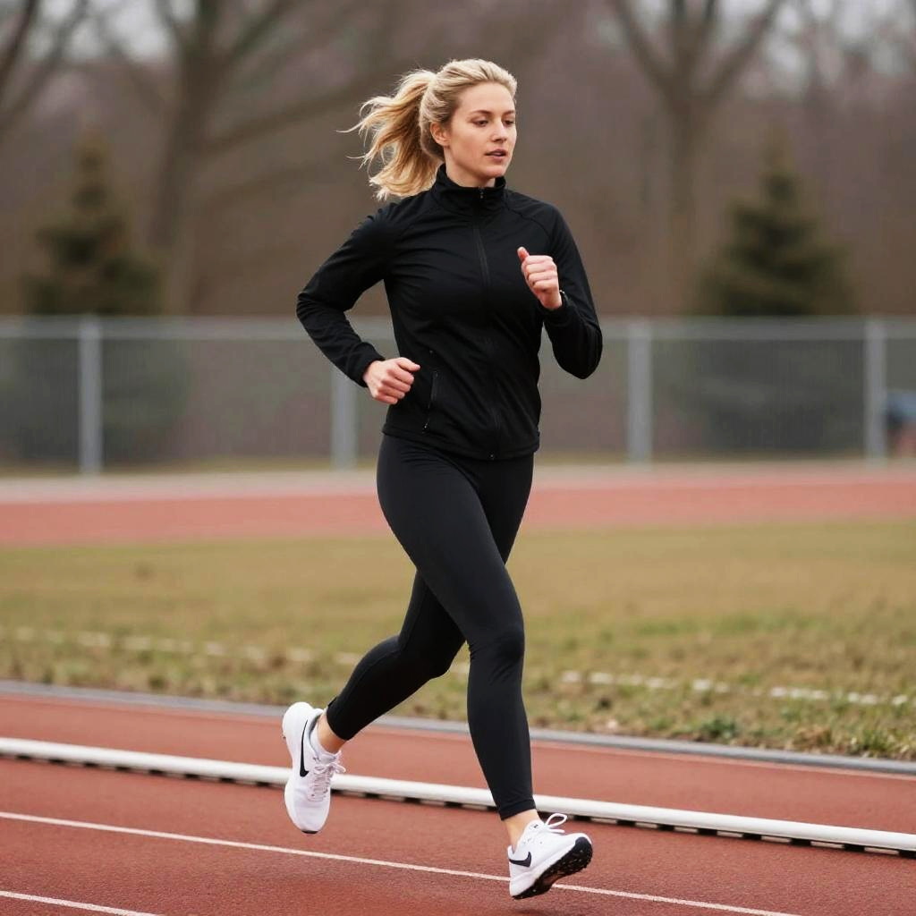 A woman dressed in black athletic wear is running on an outdoor track during a cloudy day. She wears white running shoes and appears focused on her workout, with her hair tied back in a ponytail.