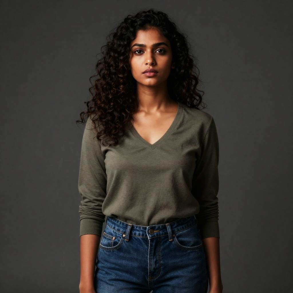A young woman with curly hair stands confidently against a dark background, wearing a casual olive green long-sleeve top and high-waisted blue jeans. The portrait captures a natural, minimalistic style with soft lighting highlighting her features and textured hair.