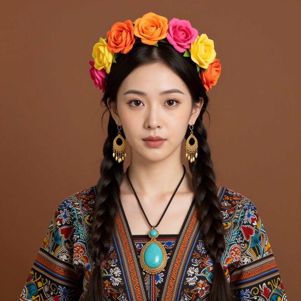 A young woman with long braided hair wears a colorful floral crown and traditional patterned clothing, complemented with large gold earrings and a turquoise pendant necklace. Her serene expression against a plain brown backdrop emphasizes the vibrant cultural accessories and intricate textile design.