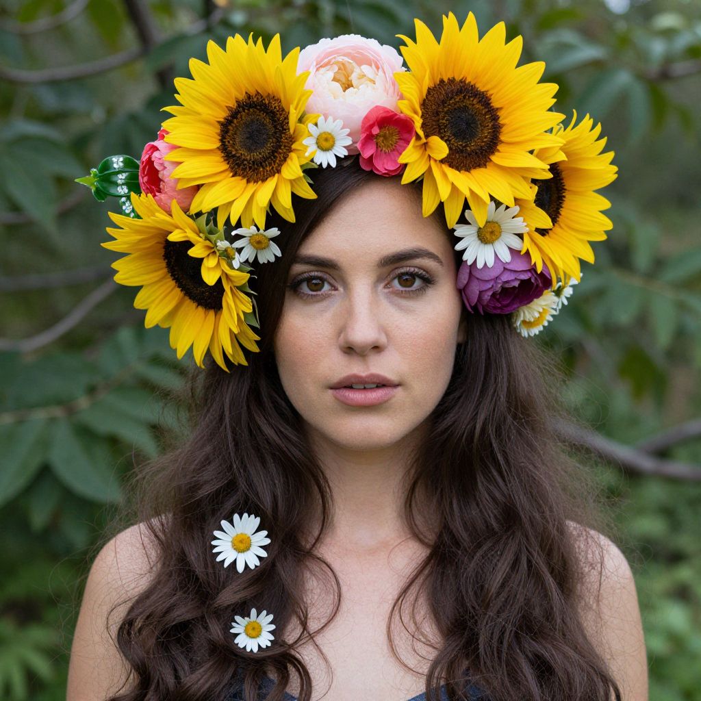 Woman Wearing Sunflower and Daisy Floral Crown Outdoors