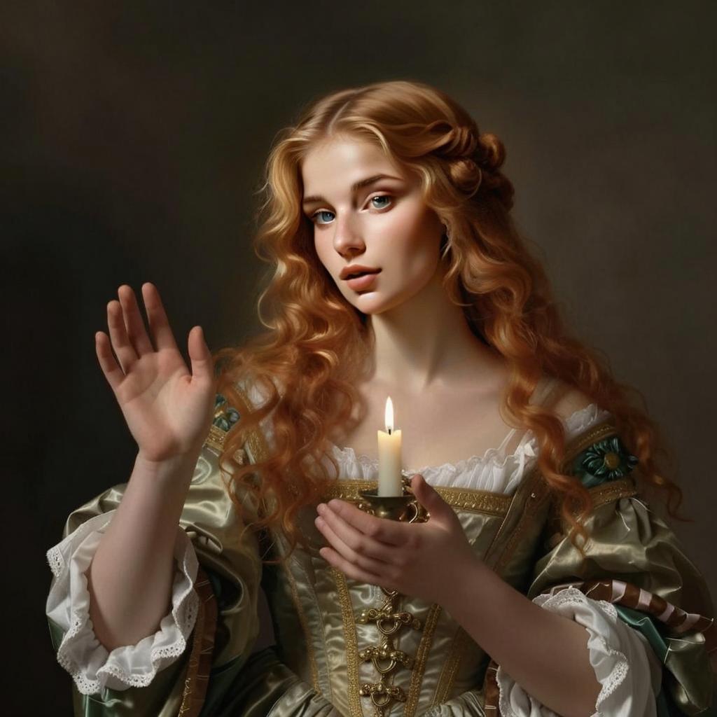 A young woman in a detailed, luxurious Renaissance-style gown holds a lit candle in one hand while raising the other in a gentle gesture. Her long, wavy red hair frames her serene and elegant expression, set against a dark, softly blurred background that enhances the classical portrait style.