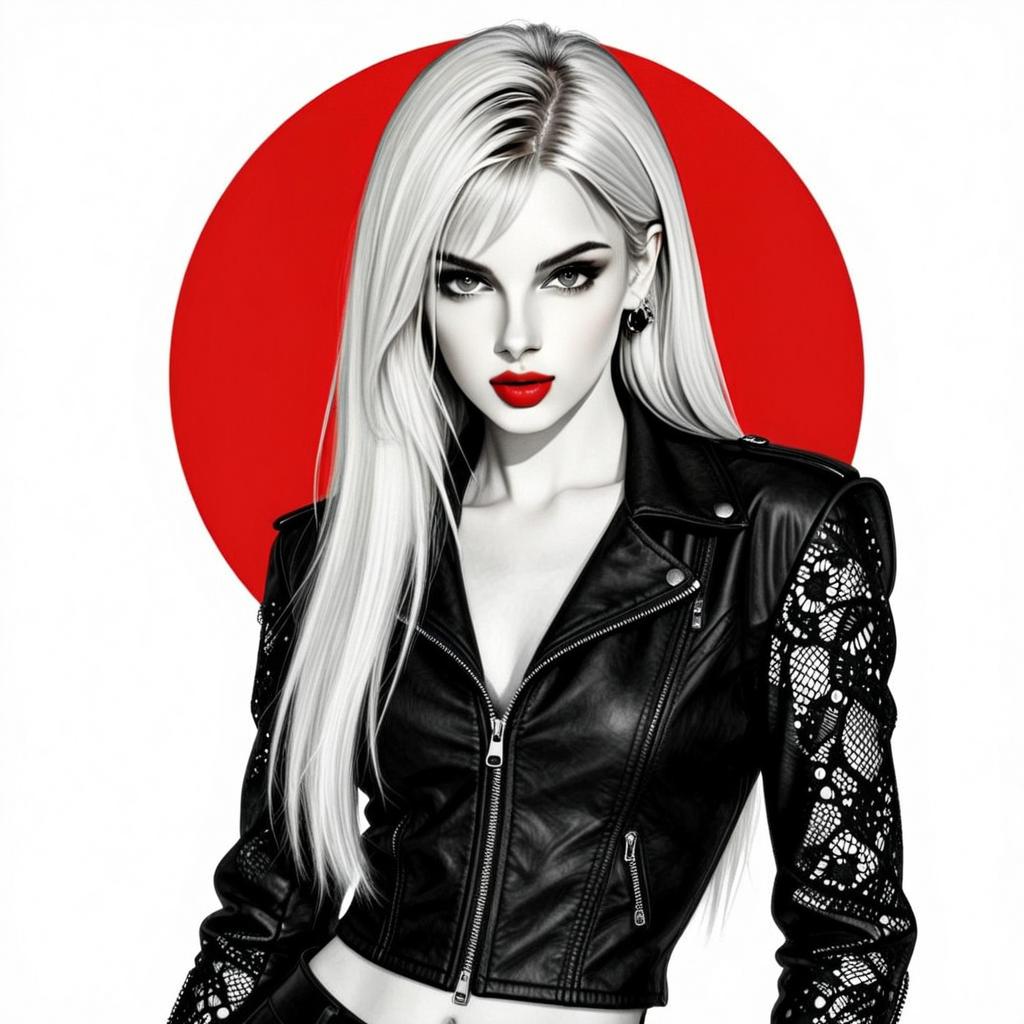 A striking digital illustration of a confident woman with long platinum blonde hair, wearing a black leather jacket with intricate lace sleeves. Her bold red lipstick contrasts sharply against the monochrome palette and a vivid red circle backdrop, enhancing the image's modern, edgy aesthetic.