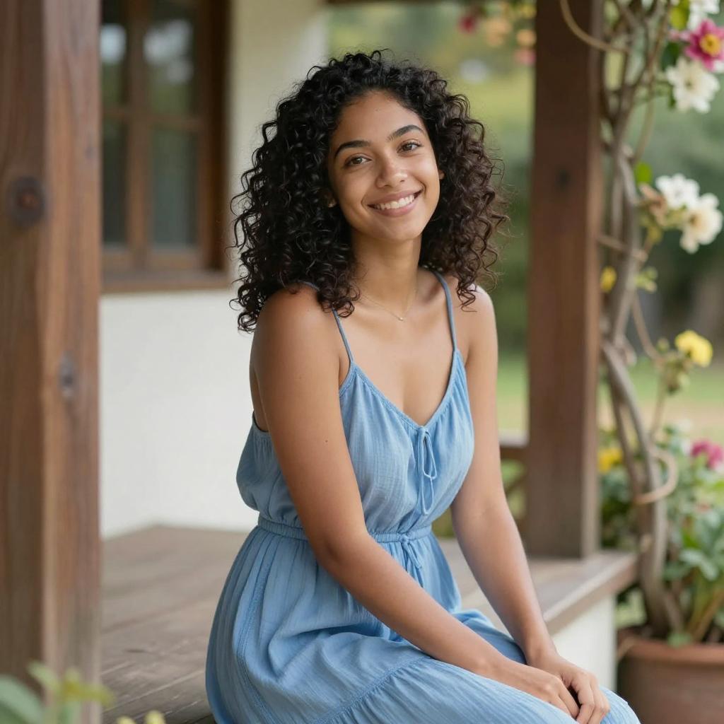 A young woman with curly hair is sitting on a wooden porch surrounded by blooming flowers, wearing a light blue summer dress. She smiles warmly, embodying a relaxed and natural vibe in this outdoor setting that highlights casual, modern style.