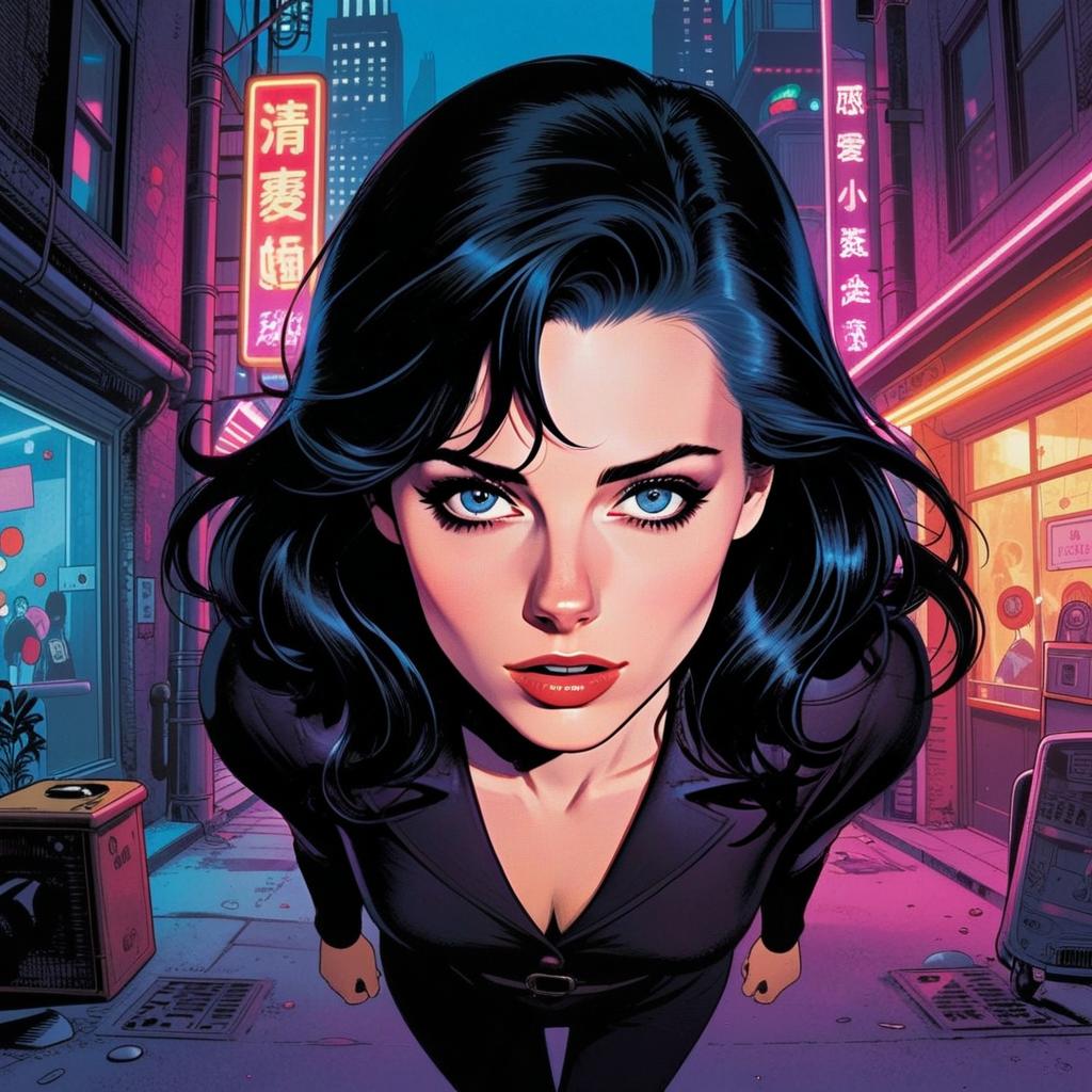 A striking digital illustration of a woman with piercing blue eyes and black hair, set against a vibrant neon-lit urban street with East Asian signage. The artwork displays a cyberpunk aesthetic, blending detailed character art with a colorful, atmospheric city backdrop.