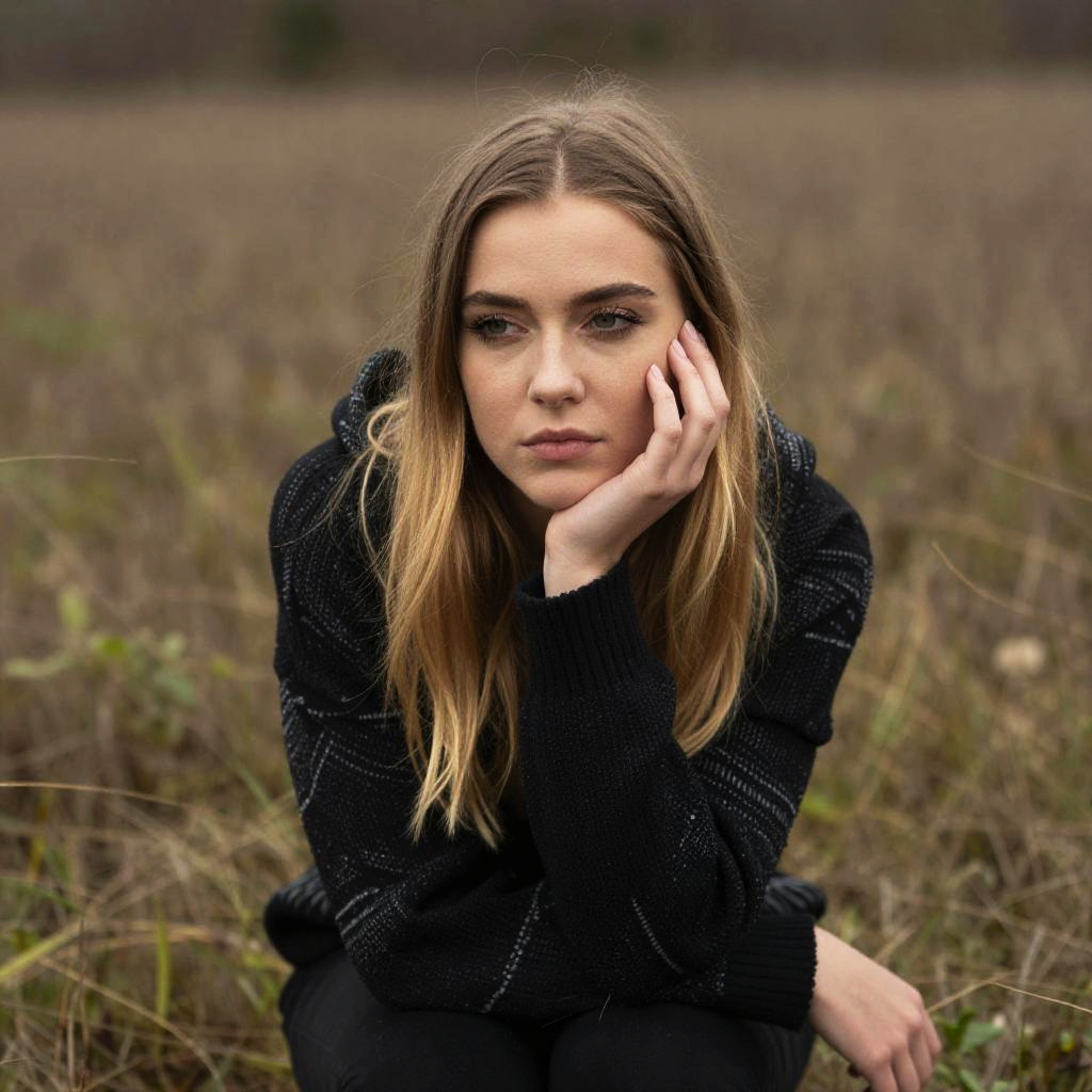 A thoughtful young woman with long blonde hair is sitting outdoors in a natural grassy field, resting her face on her hand. She wears a black sweater with subtle pattern details, and the muted background creates a contemplative and serene mood.