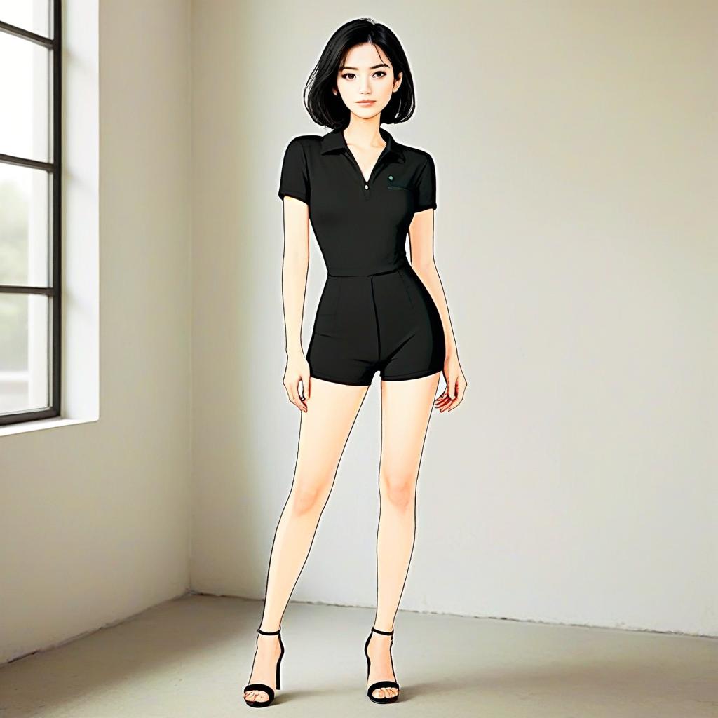 A stylish young woman poses confidently in a minimalist room wearing a sleek black outfit consisting of a short-sleeve collared top and high-waisted shorts. The image features a clean, modern aesthetic with soft natural lighting from a window, capturing a contemporary fashion vibe with an illustrated art style.