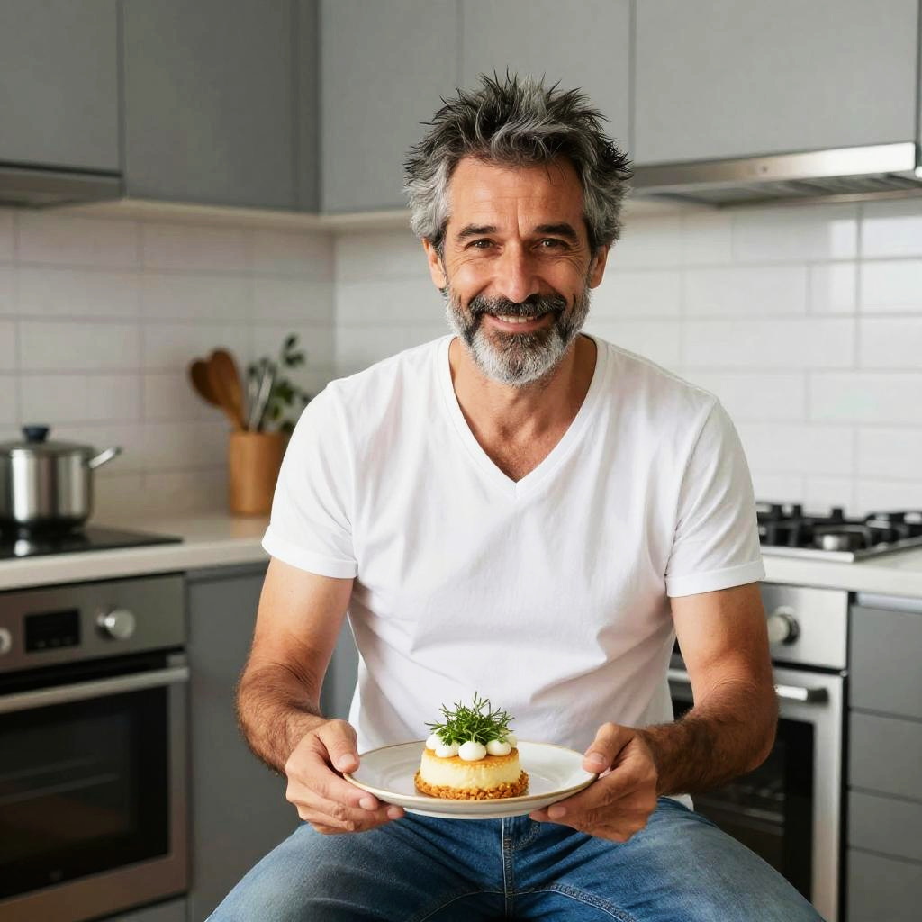 A middle-aged man with salt-and-pepper hair and beard sits in a modern kitchen holding a plated dessert garnished with herbs. He wears a white t-shirt and jeans, smiling warmly at the camera, exuding a casual and approachable vibe in a contemporary home setting.