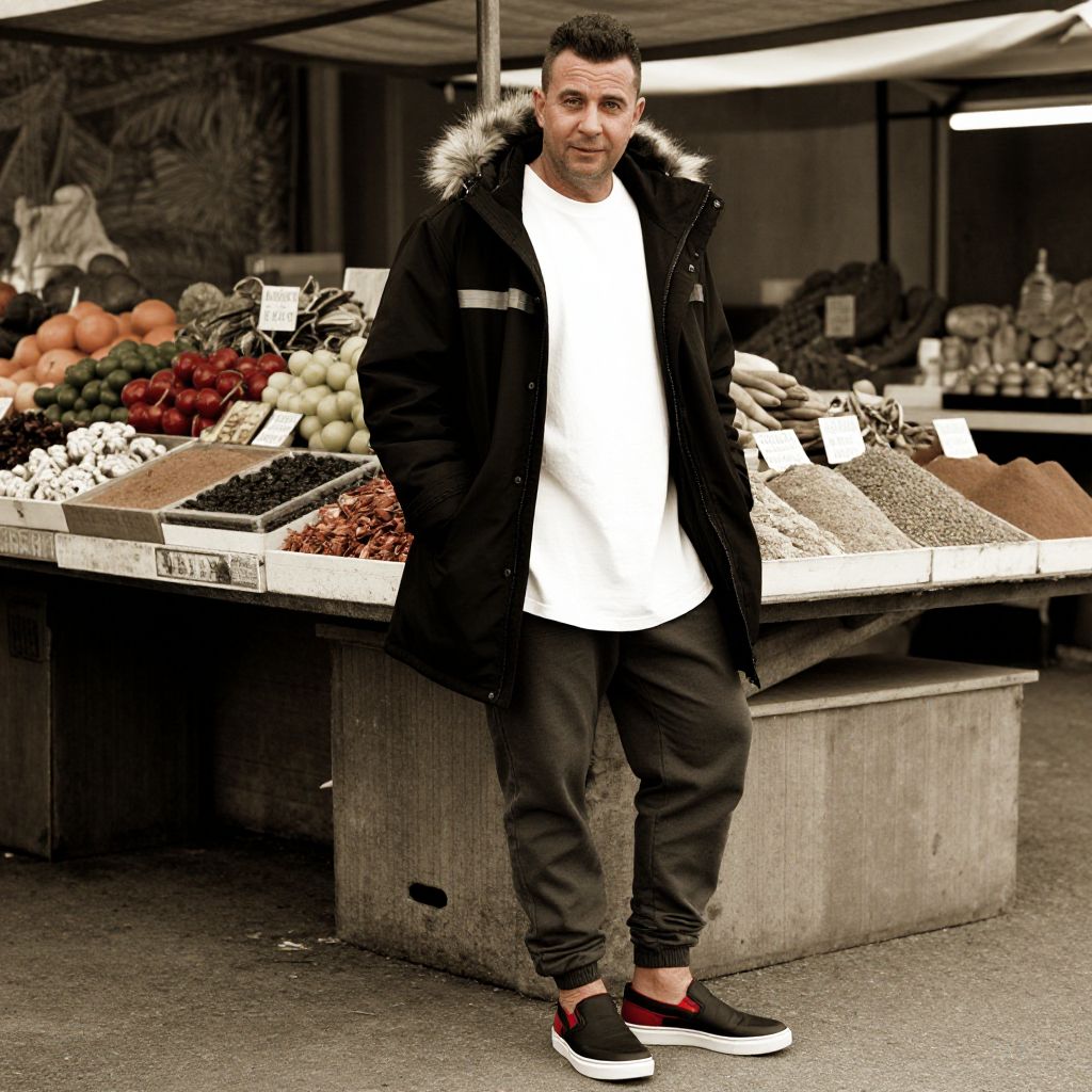 A casually dressed man stands confidently in front of a market stall filled with fresh fruits and assorted spices. He wears a black jacket with a fur-lined hood over a white shirt, paired with dark jogger pants and slip-on shoes, creating a relaxed yet stylish look.