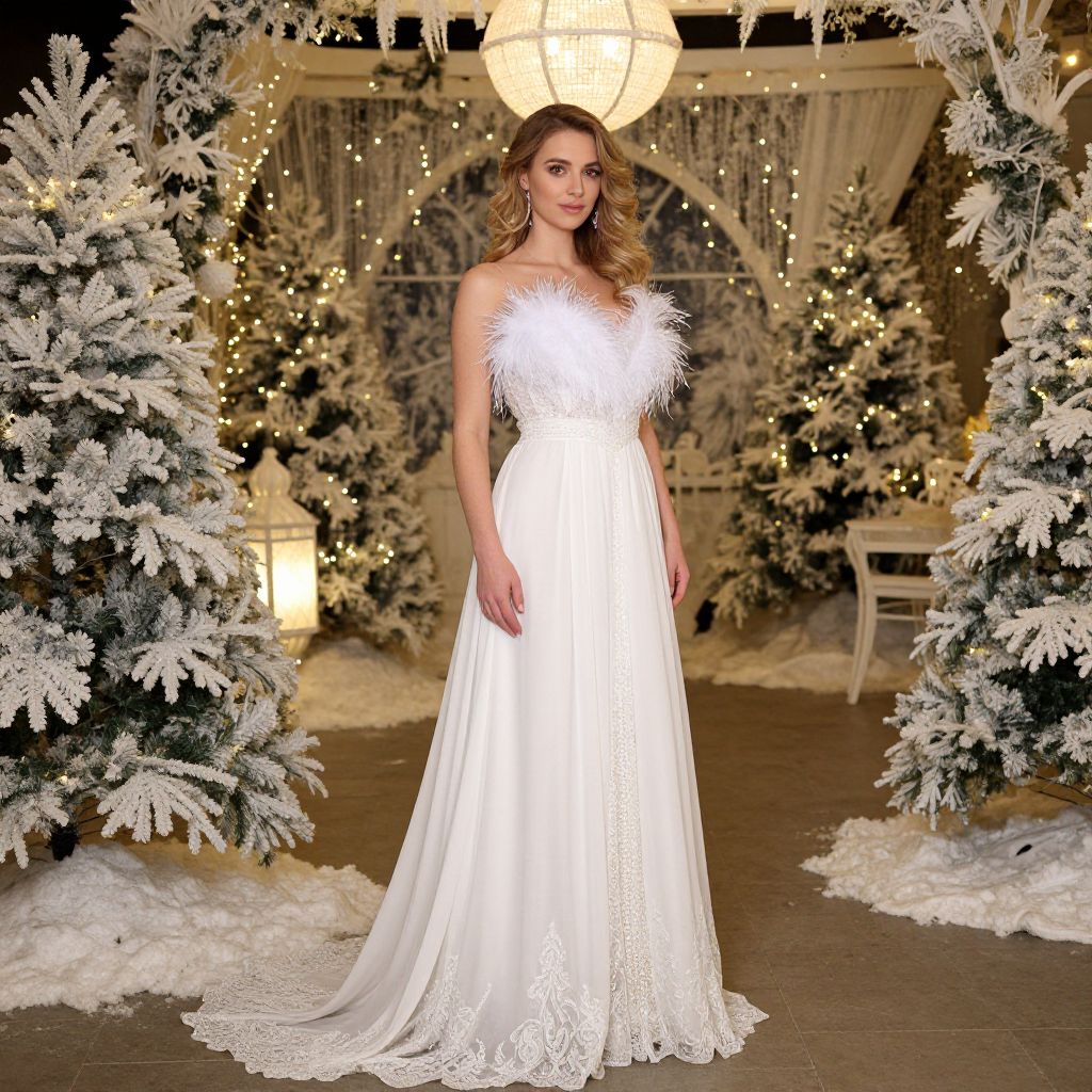 Elegant Woman in Feather-Detail White Gown Winter Christmas Setting