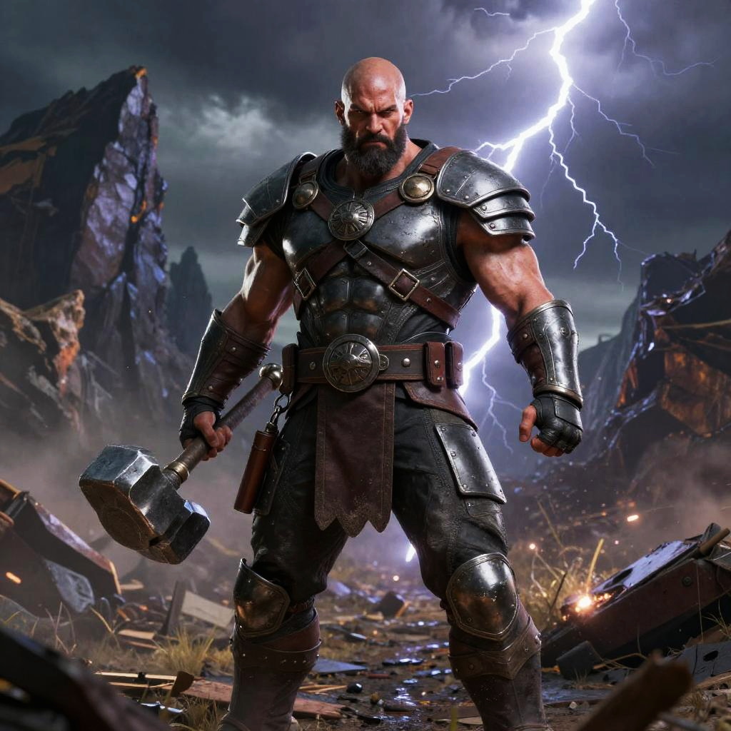 A muscular, bald warrior clad in dark, medieval-style armor stands firmly in a stormy, rocky battlefield. He wields a massive hammer and is set against a dramatic backdrop illuminated by a striking bolt of lightning, conveying power and intensity in a fantasy action scene.