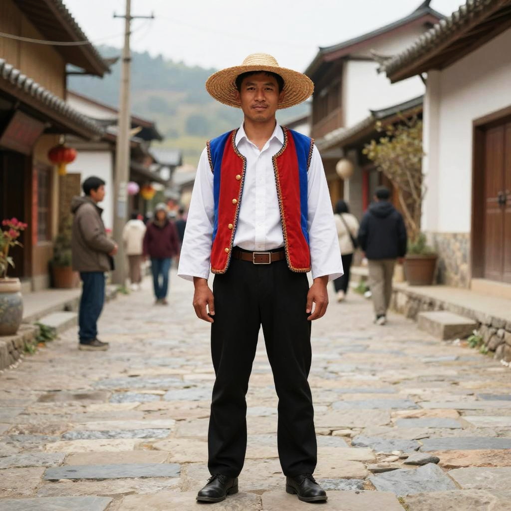 A man stands confidently on a cobblestone street in a traditional village setting, wearing a colorful red and blue vest over a white shirt paired with black pants, and a wide-brimmed straw hat. The serene background features wooden houses with tiled roofs and a few blurred pedestrians walking, creating a peaceful rural atmosphere.