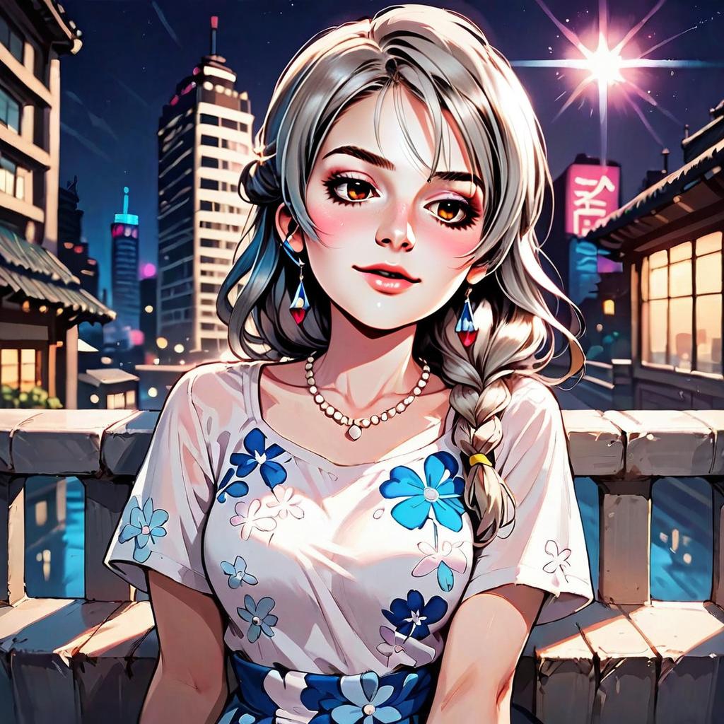 This digital artwork features a young woman with a braided hairstyle and expressive amber eyes, dressed in a white top adorned with blue floral patterns. She is set against a vibrant nighttime cityscape with glowing neon signs and modern buildings, blending traditional elements with a contemporary urban atmosphere. The illustration style combines detailed character design with vivid colors and dynamic lighting typical of modern anime-inspired digital art.