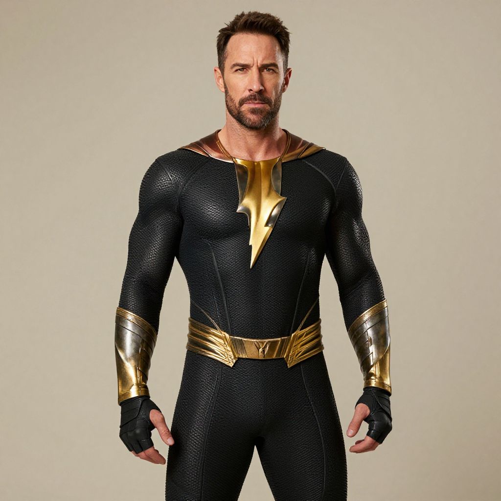 A man is dressed in a sleek, black superhero costume featuring a prominent golden lightning bolt across the chest, complemented by metallic gold gauntlets and belt. The costume's texture is detailed, emphasizing a modern and strong superhero aesthetic against a neutral background.