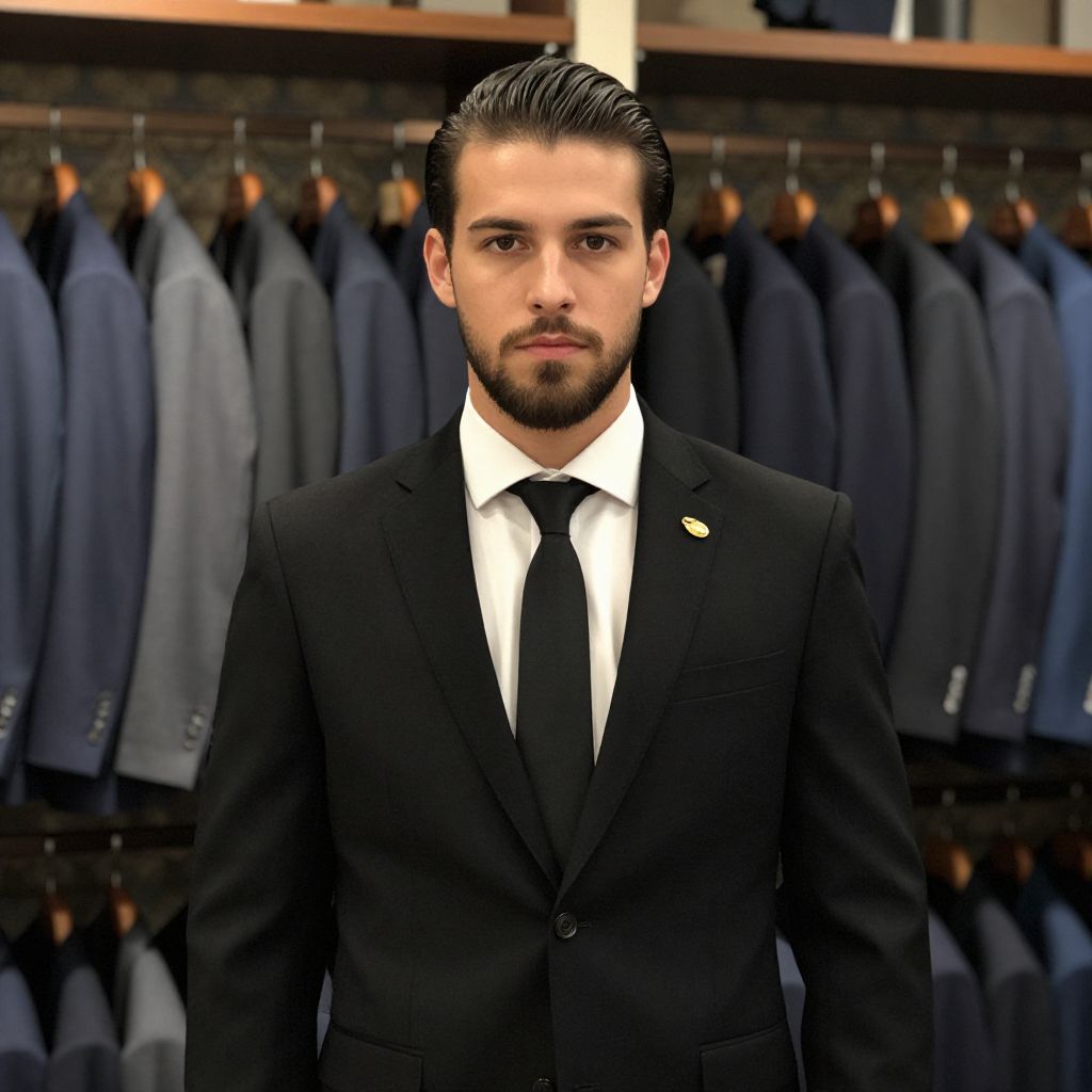 Confident Man in Black Suit Posing in Menswear Store