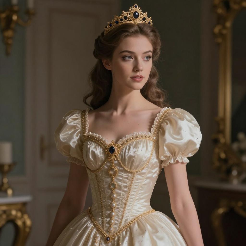 A young woman dressed in an elegant, vintage-inspired ivory satin gown with puffed sleeves and intricate gold and pearl embellishments, complemented by a regal gold tiara adorned with dark blue gemstones. The setting evokes a classical royal ambiance, highlighting her poised and graceful demeanor.