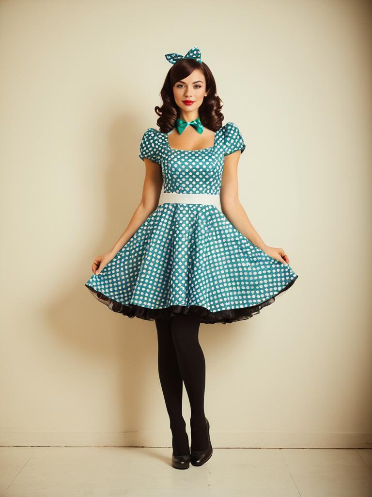 The woman is dressed in a full-body retro party outfit featuring a teal polka dot dress with puffed sleeves and a white waistband, paired with black tights and black shoes. Her look is complemented by a matching bow headband and a teal bow tie, embodying a classic vintage 1950s style with elegant curls and red lipstick.