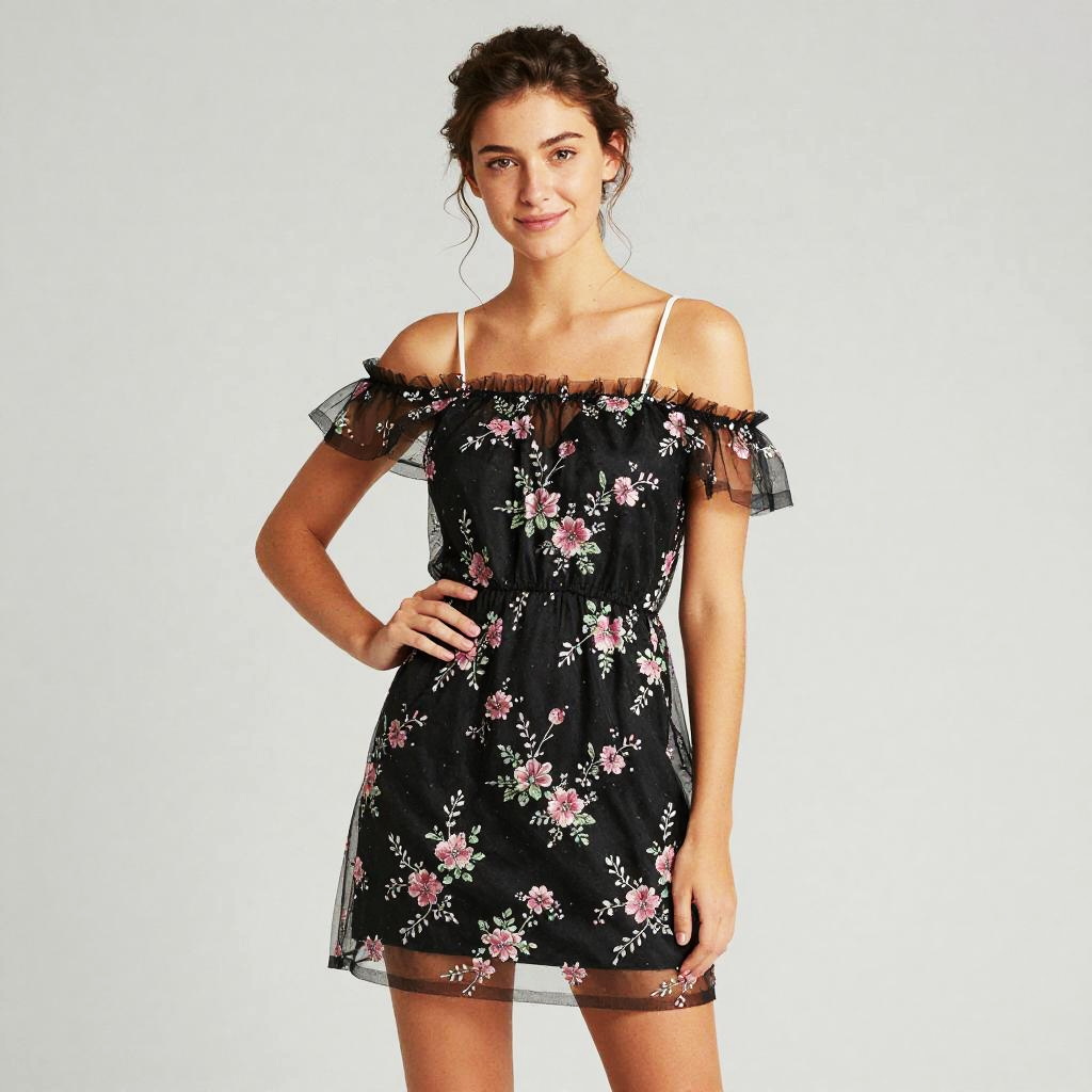 A young woman models a stylish black off-shoulder mini dress adorned with delicate pink floral embroidery and sheer ruffled sleeves. The dress features thin white straps and a fitted waistline, blending romantic and modern fashion elements against a simple gray backdrop.