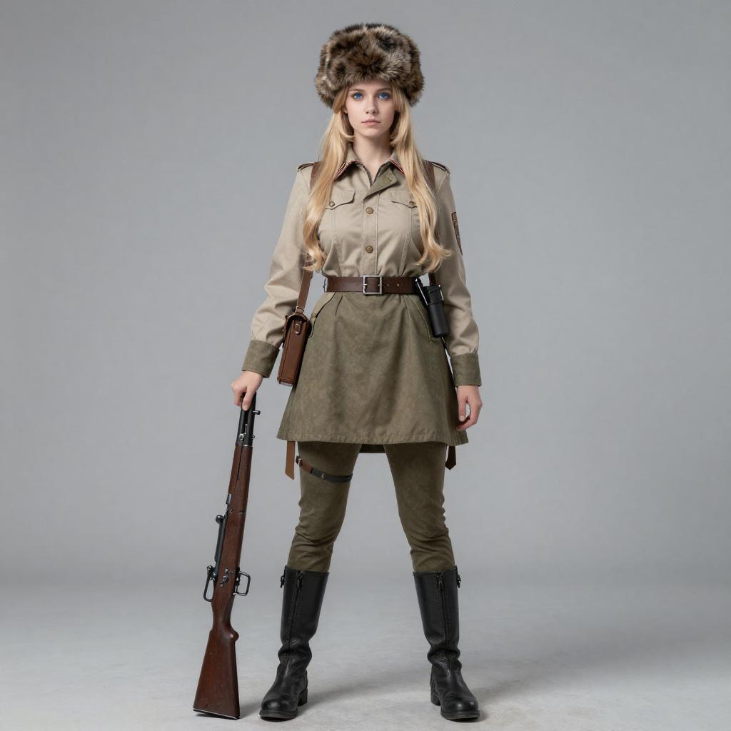 A woman dressed in a historical military-style uniform inspired by the Mosin-Nagant rifle era stands confidently against a plain background. She wears a fur hat, a khaki tunic, fitted pants, and black boots while holding a vintage rifle, reflecting a realistic reenactment or cosplay style with a modern polished studio aesthetic.
