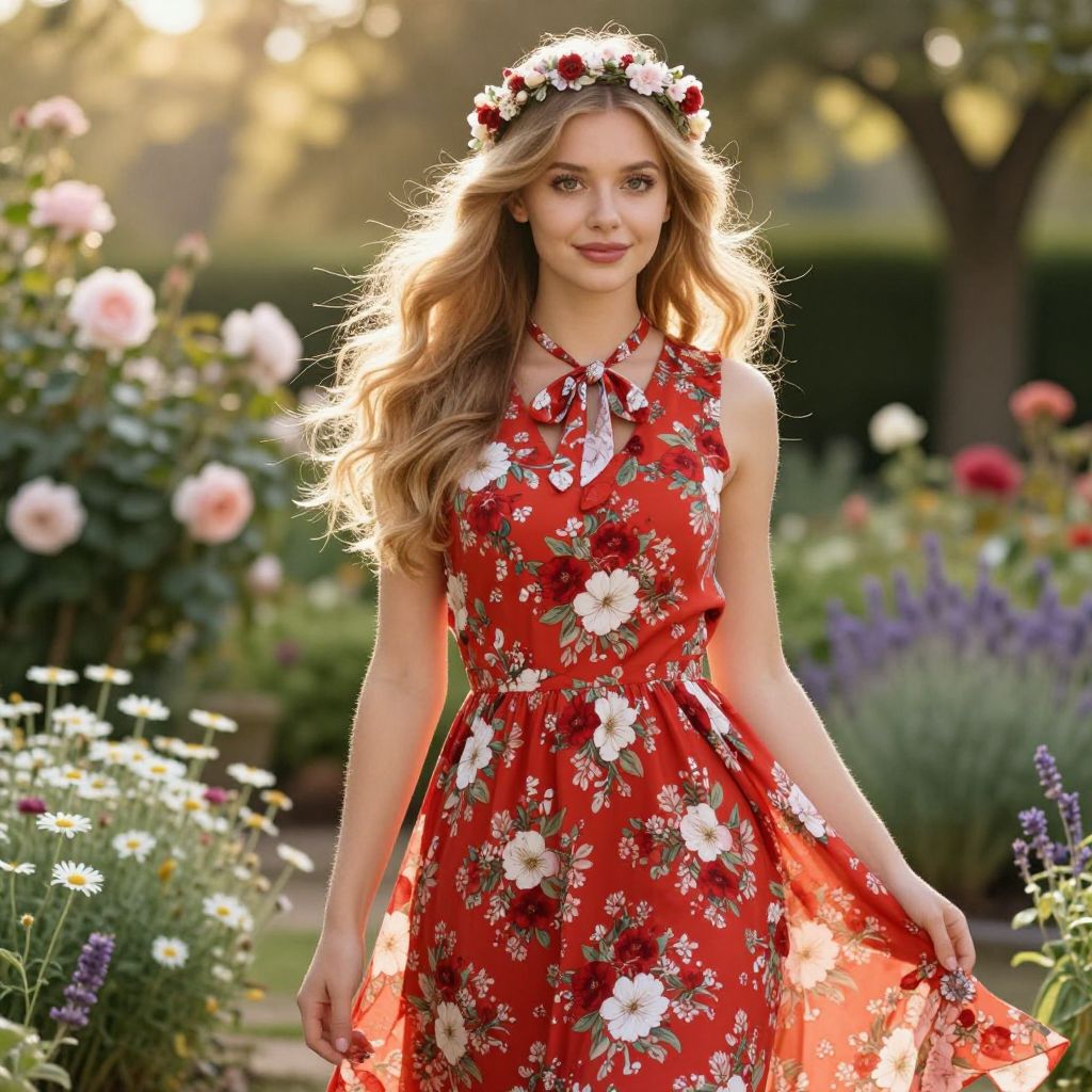 A young woman wearing a vibrant red floral dress and a flower crown stands gracefully in a sunlit garden full of blooming flowers. Her soft, wavy blonde hair and serene expression complement the warm, natural ambiance of the outdoor setting.