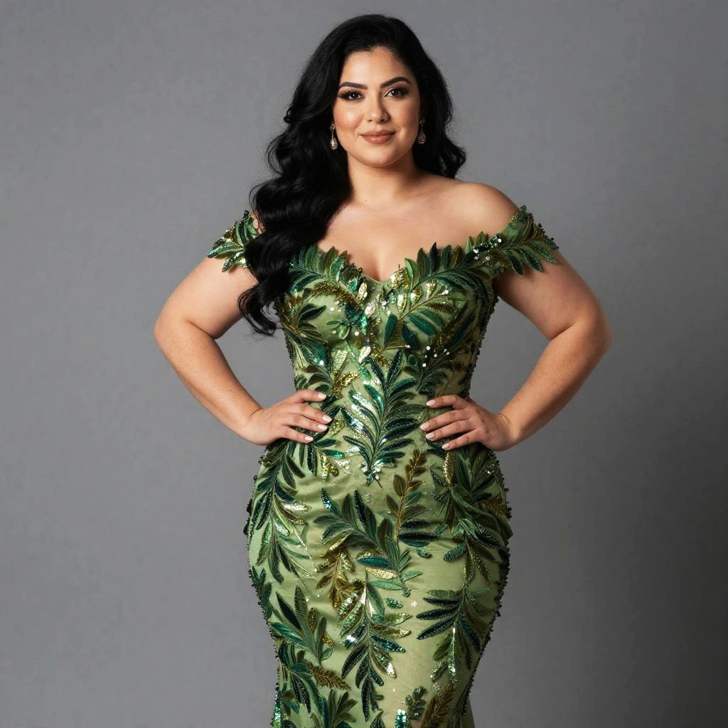 A confident woman poses gracefully in an elegant off-shoulder green gown adorned with intricate leaf-patterned sequins and embroidery. Her long, wavy black hair complements the sophisticated and nature-inspired design of the dress, set against a simple gray background.