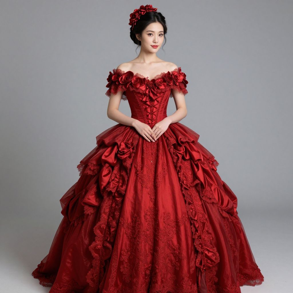 A woman elegantly poses in a luxurious deep red ball gown adorned with intricate floral lace and ruffled satin details. The off-shoulder design with rose embellishments and the voluminous skirt create a classic, romantic style evocative of vintage Victorian fashion.