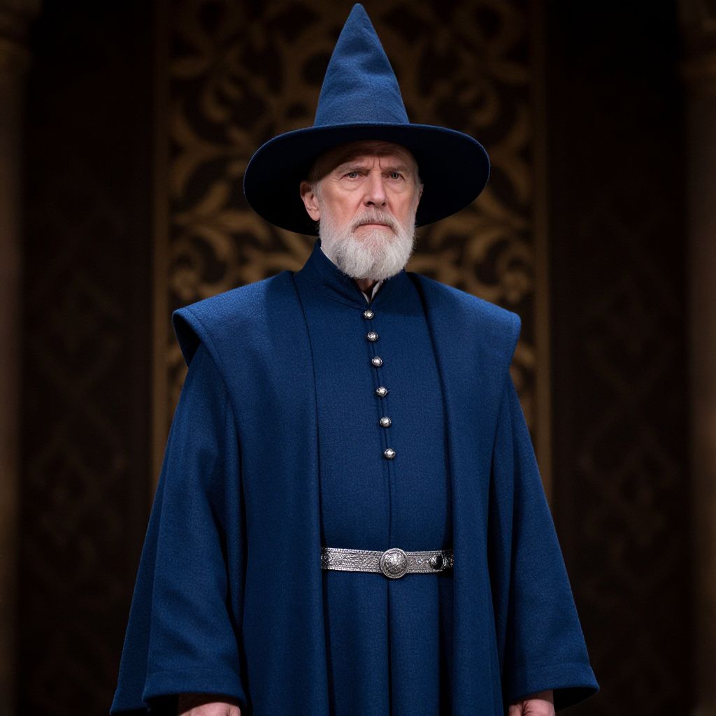 An elderly man dressed in a dark blue wizard costume with a pointed hat and silver belt stands against a richly patterned backdrop, evoking a fantasy or medieval theme. His white beard and serious expression add to the mystical and authoritative presence typical of a classic wizard archetype.