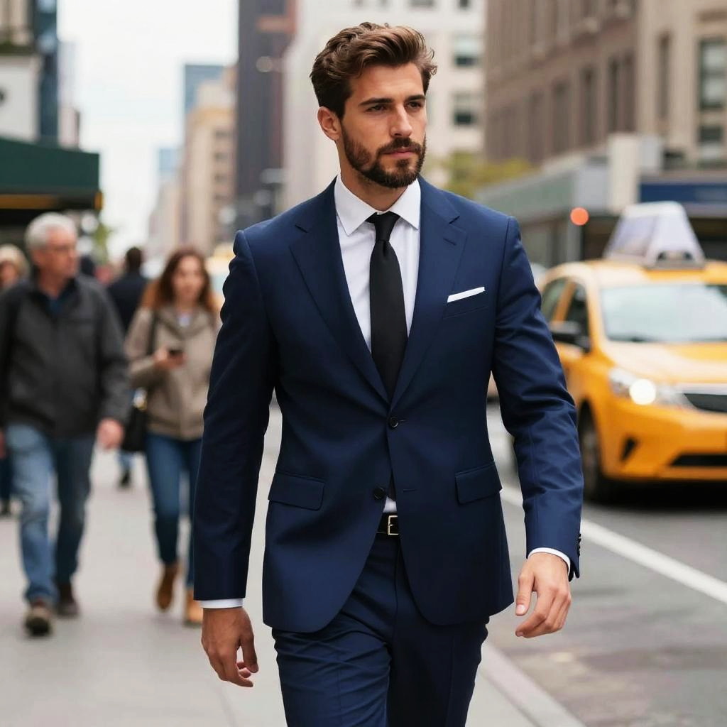 A confident man in a sharp navy blue suit walks down a busy city street, exuding professionalism and style. The urban background with people and a yellow taxi enhances the dynamic and modern atmosphere of the scene.