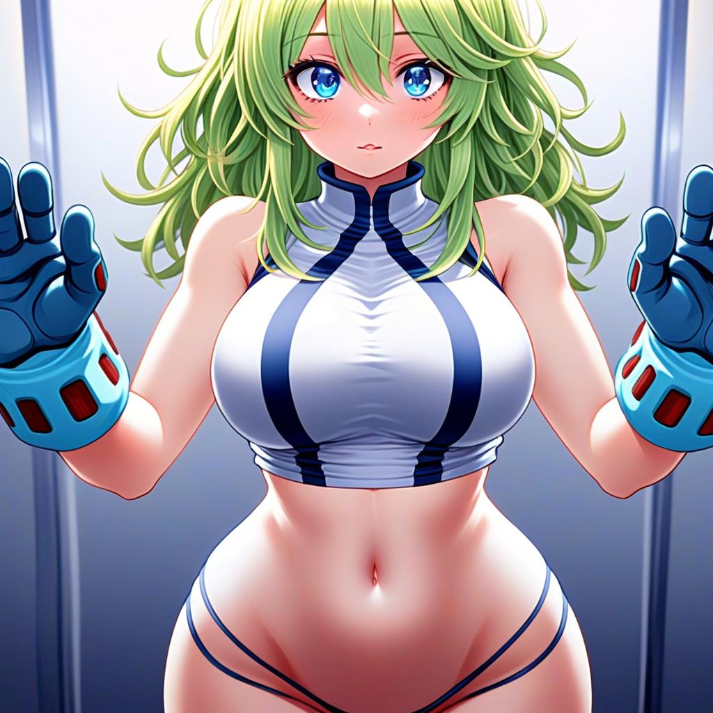 This vibrant anime-style illustration features a confident young woman with green hair and striking blue eyes, dressed in a futuristic athletic outfit with high-tech gloves. The digital artwork highlights her expressive gaze and dynamic pose, rendered in a polished, colorful style typical of modern Japanese animation illustrations. The character exudes strength and determination, set against a sleek, minimalistic background.