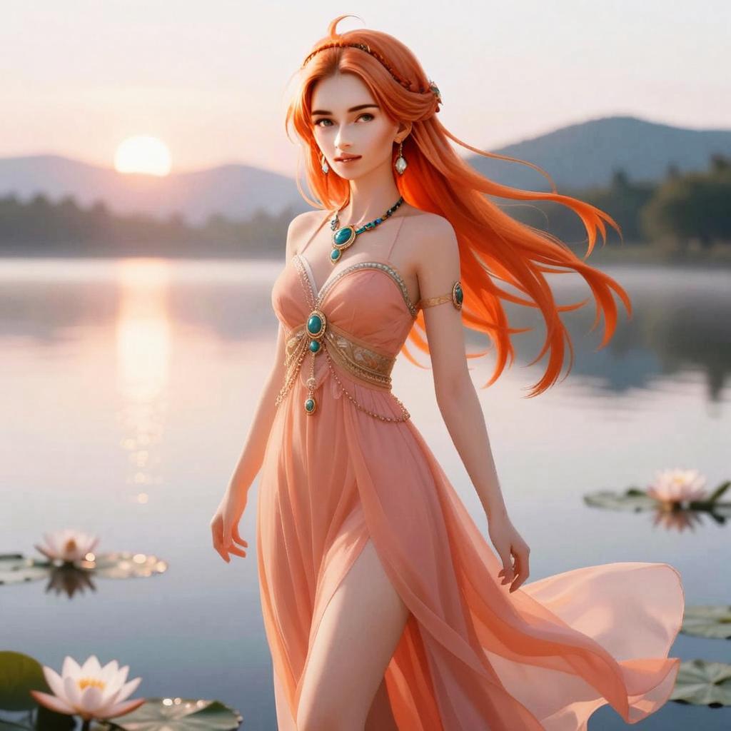 A striking red-haired woman stands gracefully by a serene lake at sunset, her flowing peach dress adorned with turquoise jewelry that glistens softly in the warm light. The scene blends fantasy and realism with an elegant, ethereal atmosphere and detailed digital art style.