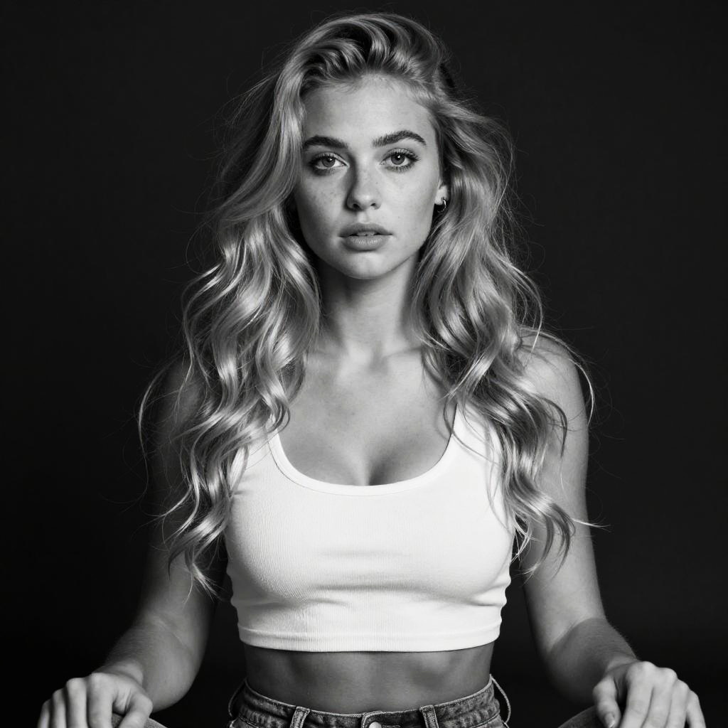 A striking black and white portrait of a young woman with long, wavy blonde hair wearing a white crop top and denim jeans. The image captures her confident and direct gaze against a solid dark background, emphasizing the contrast and details in a classic studio style.