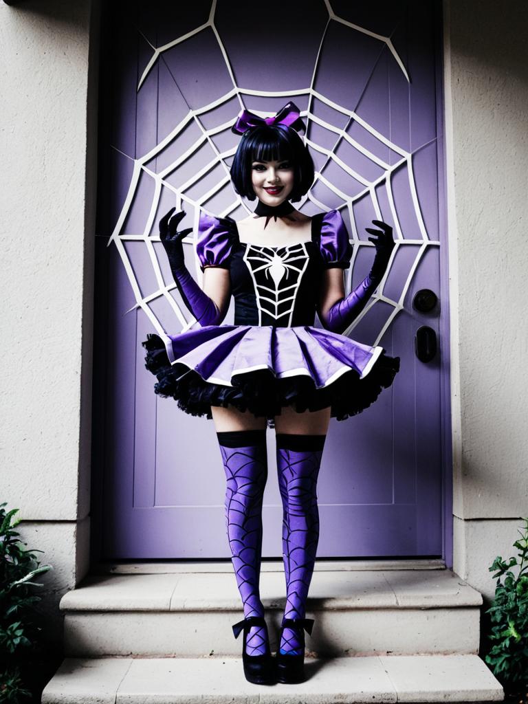 A woman dressed in a striking purple and black spider-themed costume poses confidently in front of a purple door adorned with a large white spiderweb decoration. Her outfit features a short, puffy skirt, spiderweb-patterned stockings, and gloves, complemented by a black bob hairstyle and a matching bow, exuding a playful yet gothic vibe.