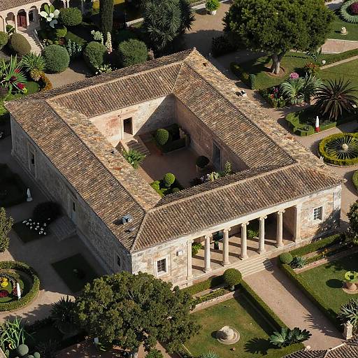 This vibrant photograph shows a sunlit, white Mediterranean-style building with black-framed windows and doors. The rooftop and balconies feature potted plants, including red and green foliage. A black metal railing runs along the right side of the image, leading down to a sun-drenched patio with more plants. The sky above is a clear, vivid blue.