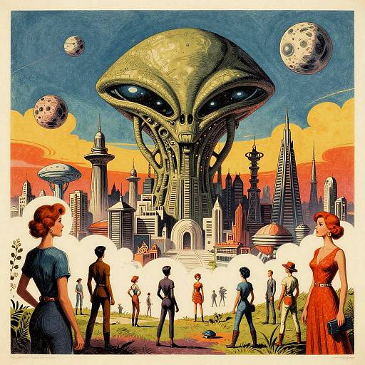 Retro-Futuristic Inventor, a 1960s novel cover depicting a woman and an alien, in the style of trompe-l'œil illusionistic detail, clockpunk, lively domestic tableaus, dark cyan and amber tones, art by Julie Bell, Les Edwards