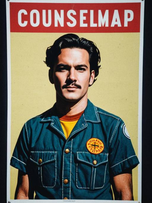 Man in Counselor Camp Poster Costume, waist-up portrait with retro poster detail
