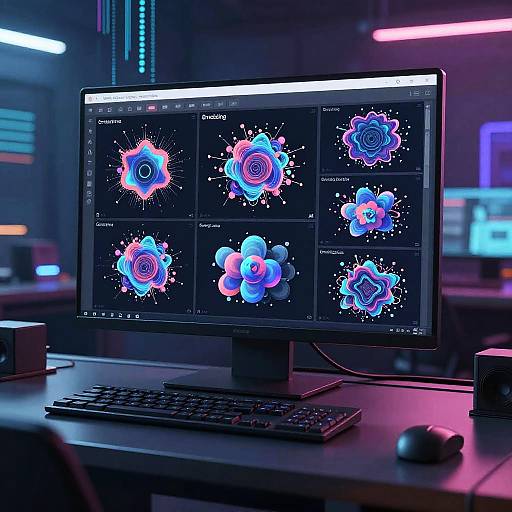 3D glass rendering of a futuristic portrait emerging from a glowing grid. The design includes vibrant colors, with surreal lighting and abstract 3D elements creating a high-energy, dynamic composition.