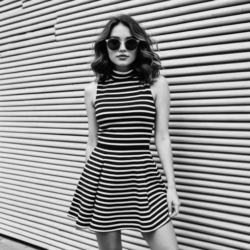 Woman, sporty chic, bodycon tank dress in bold horizontal stripes, neon color scheme with hot pink, electric blue, bright orange, and lime green, scoop neckline, sleeveless, mini-length, large hoop earrings, long straight hair, nighttime cityscape with blurred street lights.