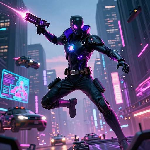 Action-packed scene of a nimble cyber scout, wearing adaptive mesh nano-suit. The composition includes neon-lit cityscape evasion and pulse rifle fire, blending Ghost in the Shell influences with dynamic futuristic technology in a highly detailed, hypermodern design.