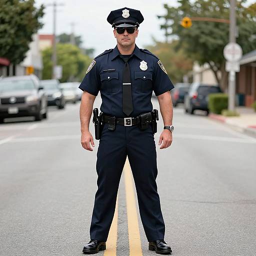 courageous young man, messy dark hair, muscular build, police outfit, authoritative uniform style, navy blue shirt, matching trousers, rugged black boots, police cap, L’Officiel, Moroccan Tile