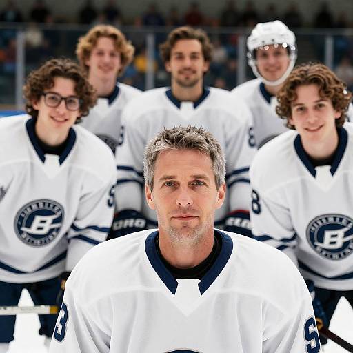a smiling young woman with light brown hair in a blue, red, and white hockey jersey with "USA" on the chest. She holds a pair of red, white, and blue hockey gloves. Another woman with brown hair stands blurred in the background. They are indoors near an ice rink.