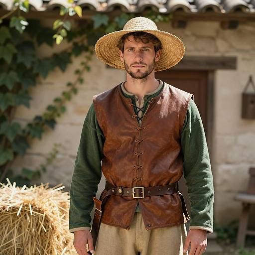 Impressionist painting of a charming village blacksmith in rustic leather apron style. Rendered in hyper-realism with warm earth tones and influenced by Claude Monet, Pierre-Auguste Renoir.