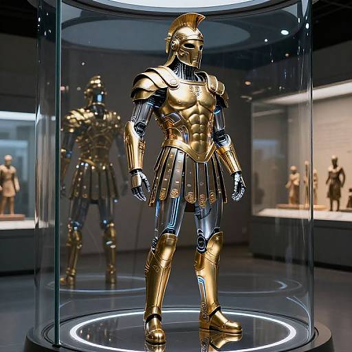 Close-up of fantasy Greek armor with elaborate engravings and embossed mythological creatures, glowing runes etched into the bronze, paired with a traditional Corinthian helmet featuring a majestic plume, illuminated by soft golden light in a sacred temple.