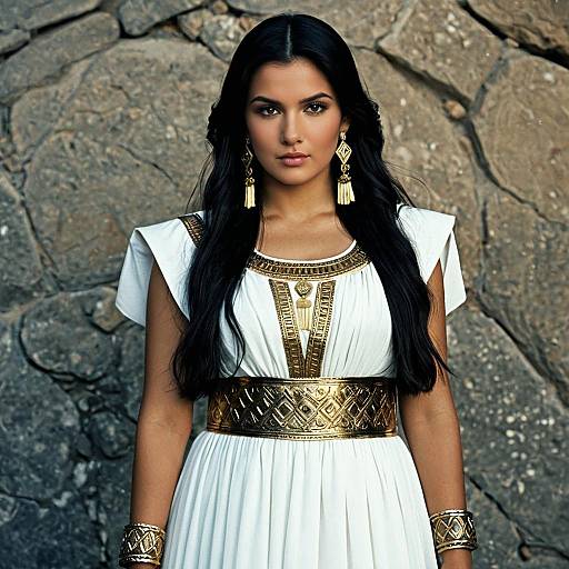 striking Greek woman with sparkling hazel eyes and thick, wavy dark hair, wearing a trendy belt and adorned with intricate gold bracelets. Dressed in stylish, tailored shorts that emphasize her glamorous appearance, she stands against a backdrop of stunning Santorini with whitewashed buildings and beautiful sunsets. The scene exudes an air of elegance and old-world charm, with intricate details that highlight the mix of modern glamour and historic surroundings.