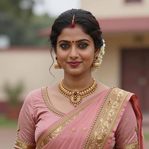 A front face photo of a graceful Indian woman with a traditional image of beauty. Known for their long black hair, serene smile, and ancient culture.