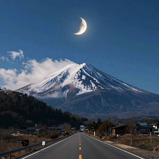 A distant mountain peak in Mount Fuji of Japan, with cherry blossom trees and a tranquil pond dotting its base under a morning mist with soft pink hues. The scene is serene yet powerful, capturing an iconic view of nature's grandeur in the style of ukiyo-e woodblock print style.