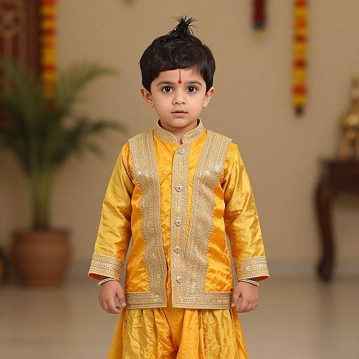 Full body-shot by Réhahn, grinning little boy, messy hair, petite build, (Navratri, Chaniya Kediyu:1.3), traditional chaniya, simple kediyu, Wispy mist texture studio background