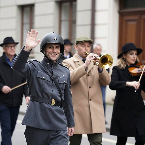 Group of people in retro outfits dancing in the street. Central figure in blue striped suit with red vest, arms raised. Others in orange, yellow, red, green suits. Balloons in background, brass band to the right. Urban setting, daylight. Union Jack flag on building. Vibrant colors, dynamic poses. About 15 people.