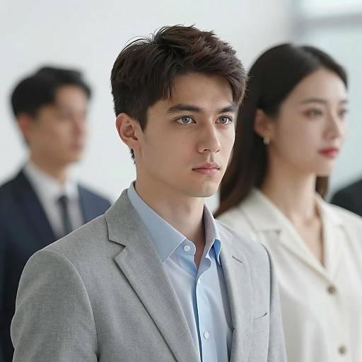 neutral outfit, photograph of a young woman with long brown hair, wearing a beige long-sleeve shirt and matching beige pants, standing against a gray background, neutral expression, soft lighting, subtle shadows, casual attire, natural makeup, minimal accessories, centered composition, realistic style, slight color gradient in background, soft ure in clothing, half-body shot, relaxed pose, minimalist background
