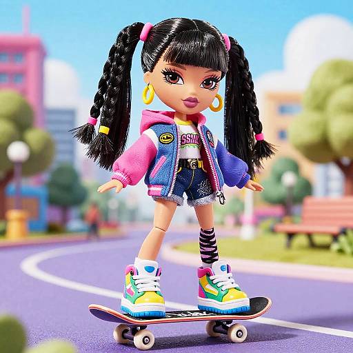 playful and vibrant young girl, bright orange pigtails, petite build, gay outfit, denim overalls with patches, kawaii street style, plain white studio background