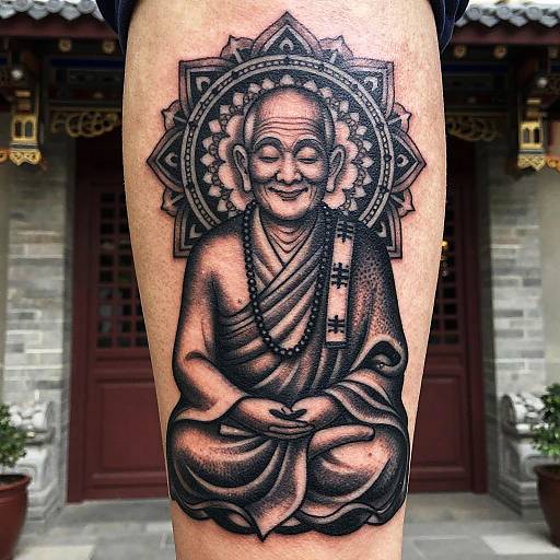 A detailed, stylized portrait of a male monk with intricate tattoos covering parts of their body, set in a tibetan monastery background. The subject is wearing simple saffron robes, showcasing an expressive and confident pose. The tattoos are detailed and colorful, inspired by mandalas and sacred symbols, blending harmoniously with the scene. The background is rich in texture and culturally inspired, featuring elements like prayer flags and stone temples, adding depth and atmosphere. The artwork style is hyper-realistic with a painterly touch, emphasizing textures, colors, and cultural influences, creating a vibrant, immersive, and slightly edgy aesthetic.