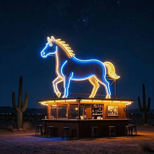 Photograph of a nighttime scene featuring a large, illuminated marquee sign shaped like an open mouth with red and white lights. To the left, a blue neon silhouette of a cowboy holds a guitar. Palm trees are visible in the background, partially illuminated by red neon on the right.